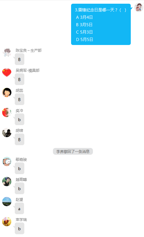 本次知識競賽內(nèi)容涵蓋雷鋒同志的事跡、生平及榮譽(yù)。競賽項目設(shè)置為單選題、多選題、填空題三個題型。團(tuán)支部在團(tuán)員群里面發(fā)送題目,題目發(fā)送后第一位答對題目的即為優(yōu)勝者。競賽前,青年團(tuán)員們都積極熟悉雷鋒精神有關(guān)知識點;比賽中,大家都積極答題、沉著應(yīng)對、密切配合。本次知識競賽活動讓青年團(tuán)員們了解了雷鋒精神,并致力將其內(nèi)化于心,外化于行,進(jìn)一步學(xué)習(xí)和弘揚(yáng)雷鋒精神。