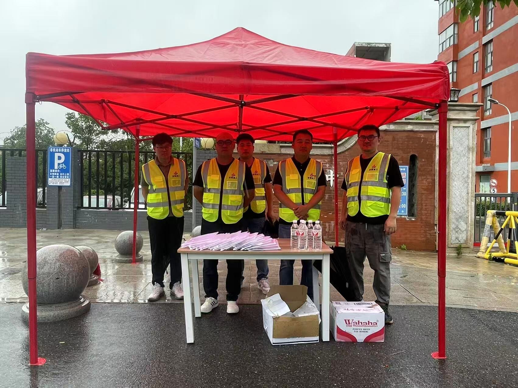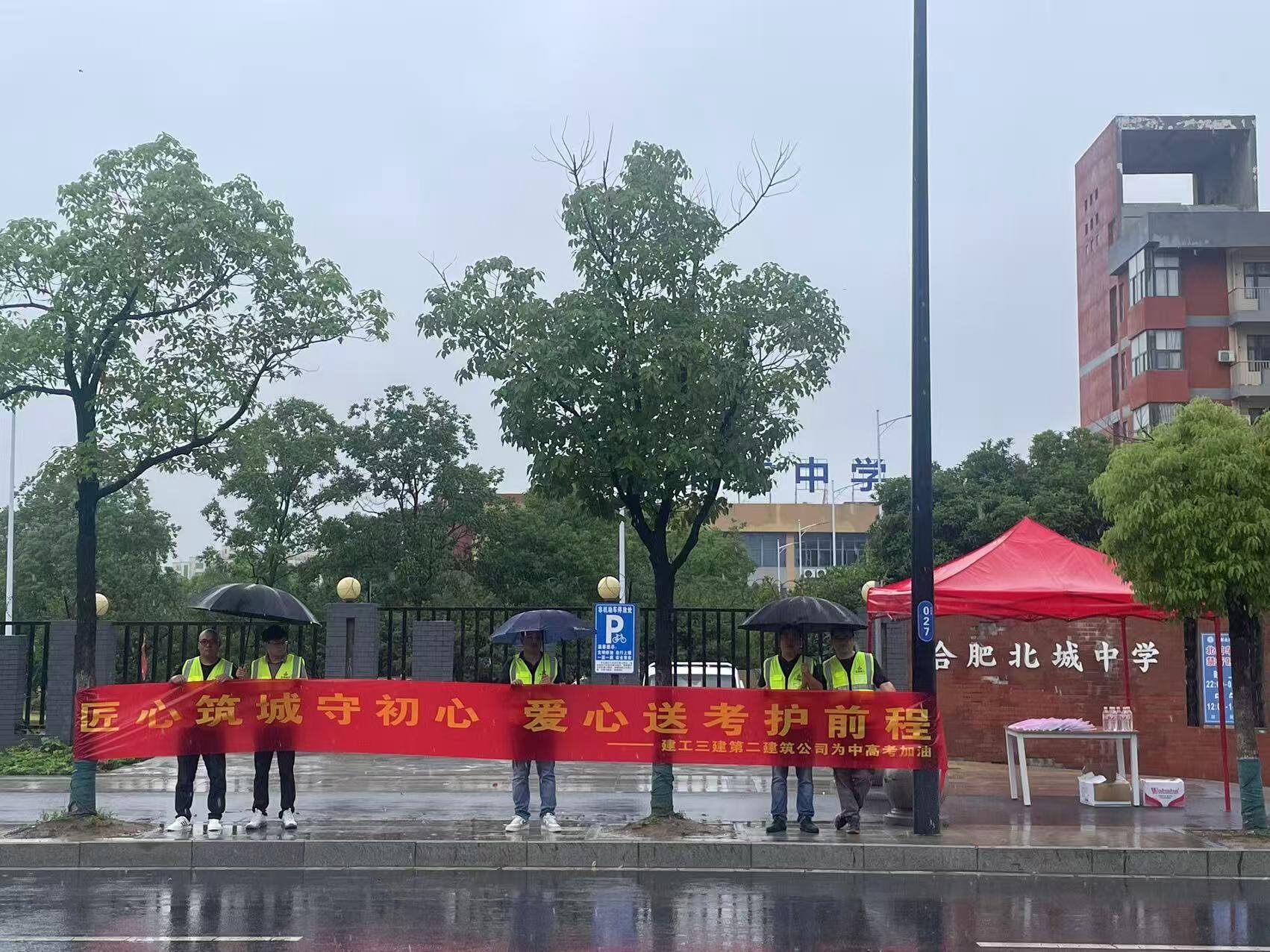 在合肥一中北城分校考點(diǎn)外,一場由合肥北城未來科技創(chuàng)新園區(qū)及基礎(chǔ)設(shè)施建設(shè)(一期二標(biāo)段)項(xiàng)目部?全體職工自發(fā)組織的愛心助考行動(dòng),為緊張的高考氛圍增添了一抹溫暖亮色,成為考場外一道靚麗的風(fēng)景線。紅色的帳篷,如同跳動(dòng)的火焰,在夏日的暴雨下,為翹首以盼的家長們筑起了一個(gè)溫暖的港灣;一瓶瓶礦泉水,滋潤了干渴的喉嚨,更傳遞了真摯的祝福;一件件應(yīng)急文具,則飽含著對(duì)學(xué)子們順利應(yīng)考的殷切期盼。在這個(gè)重要的日子里,項(xiàng)目部全體職工的心意伴隨著學(xué)子們步入考場:?祝愿所有考生筆鋒所至,夢想花開!