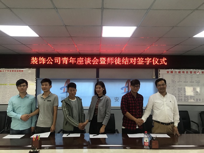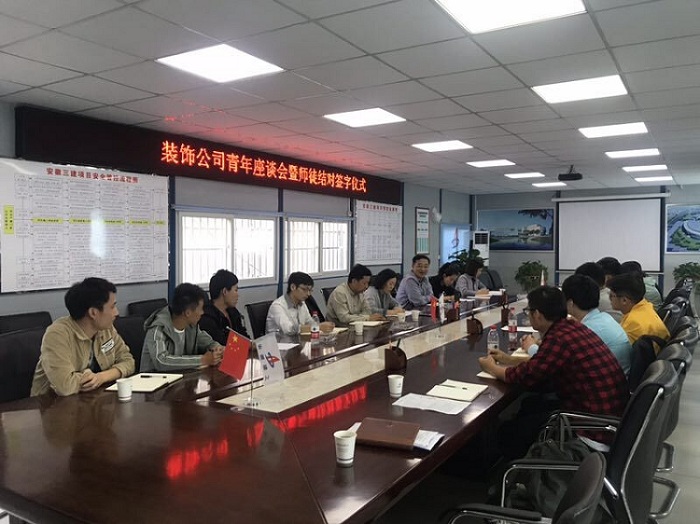 為了調(diào)動(dòng)裝飾公司青年職工的工作熱情和積極性,切實(shí)幫助青年職工解決工作和生活中的實(shí)際問題,10月12日下午,裝飾公司團(tuán)支部在創(chuàng)新館項(xiàng)目部會(huì)議室召開以“溝通交流,相互學(xué)習(xí),共同進(jìn)步”為主題的青年職工交流會(huì),并開展“師徒結(jié)對”活動(dòng)。公司經(jīng)理萬和生、黨支部書記高莉、副經(jīng)理王皖、孫一甲及所有青年員工參加了交流會(huì)。