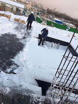 截至12月7日,煙臺市持續(xù)降雪一天一夜,安徽三建大連公司承建的煙臺力高二三四期項目現(xiàn)場覆蓋上了厚厚的積雪,臨建區(qū)域的積雪足足達到15厘米,為了保證施工生產(chǎn)安全,項目人員冒著零下四度的嚴寒,頂著飛舞的雪花,拿著鐵鏟和掃帚等清掃工具清除項目積雪。他們分工協(xié)作,有的鏟雪,有的清掃,有的堆碼。大家的臉和手雖然被凍得通紅,但是臉上都洋溢著勞動的喜悅。經(jīng)過幾個小時的團隊作戰(zhàn),院內的積雪全面清除,確保了辦公安全。