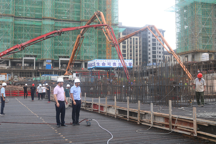 為推動(dòng)分公司項(xiàng)目部之間的內(nèi)部交流學(xué)習(xí),進(jìn)一步貫徹落實(shí)“戰(zhàn)疫情、搶工期、保目標(biāo)、促超產(chǎn)”勞動(dòng)競(jìng)賽,洽逢金寨明發(fā)超高層項(xiàng)目進(jìn)行大體積混凝土澆筑之際,8月11日上午,十一公司組織領(lǐng)導(dǎo)班子成員、各科室負(fù)責(zé)人、項(xiàng)目經(jīng)理及技術(shù)負(fù)責(zé)共計(jì)30余人前往金寨明發(fā)超高層項(xiàng)目觀摩學(xué)習(xí)大體積混凝土澆筑工藝。